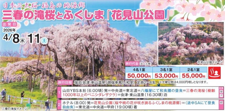 | 2 | ホテル(8:00)発=花見山公園(桜や桃の花が咲き誇るふくしまの桃源郷)=(途中SAにて昼食自由食)=