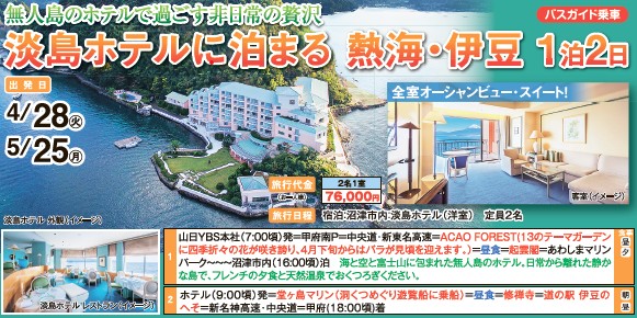 4月下旬からはバラが見頃を迎えます。) = 昼食 = 起雲閣 = あわしまマリンパーク ~~~ 沼津市内(16:00頃)泊 海と空と富士山に包まれた無人島のホテル。日常から離れた静かな島で、フレンチの夕食と天然温泉でおくつろぎください。 |