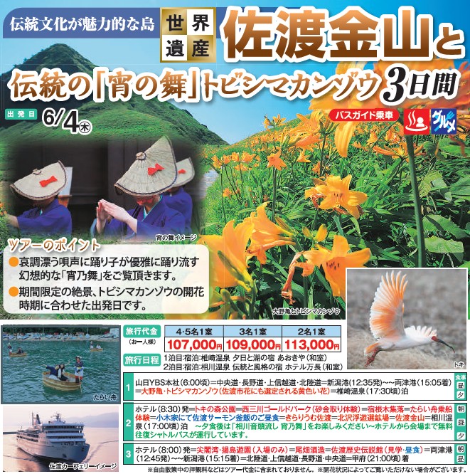 =小木家にて佐渡サーモン釜飯のご昼食=きらりうむ佐渡=北沢浮遊選鉱場=佐渡金山=相川温泉 泊(17:00頃)泊 ~夕食後は「相川音頭流し 宵乃舞」をお楽しみください~ホテルから会場まで無料往復シャトルバスが運行しています。 |