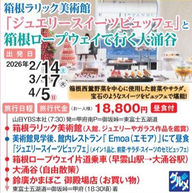 =箱根ラリック美術館(入館。ジュエリーやガラス作品を鑑賞) …美術館見学後、館内レストラン「Emoa(エモア)」にて昼食 「ジュエリースイーツビュッフェ」(メイン1品と前菜・サラダ・スイーツのセミビュッフェ) =箱根ロープフェイ片道乗車(早雲山駅→大涌谷駅)…大涌谷(自由見学)= =鈴廣かまぼこ 御殿場店(お買い物)= =東富士五湖道・御坂峠=甲府(18:30頃)着 |